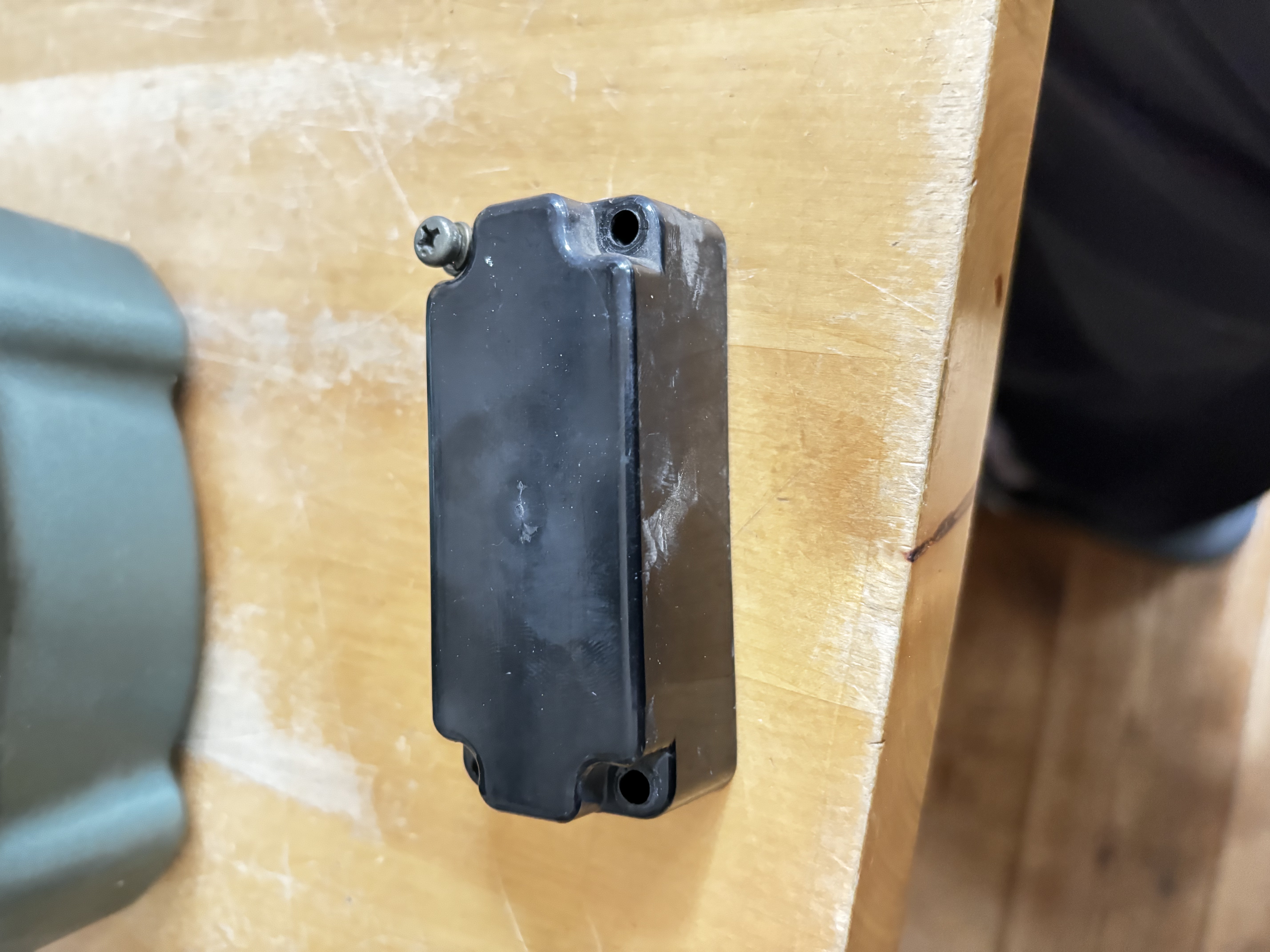 Der nächste Schritt bestand daraus das erste Steuergerät mit einer Einbaubuchse zu versehen. Hierzu musste ein Loch in die Rückwand des Gehäuses gebohrt werden und die Buchse eingeschraubt werden. Die Buchse ist vorher mit Anschlussdrähten versehen worden, sodass diese lediglich auf der Innenseite der Anschlussleiste angelötet werden mussten.