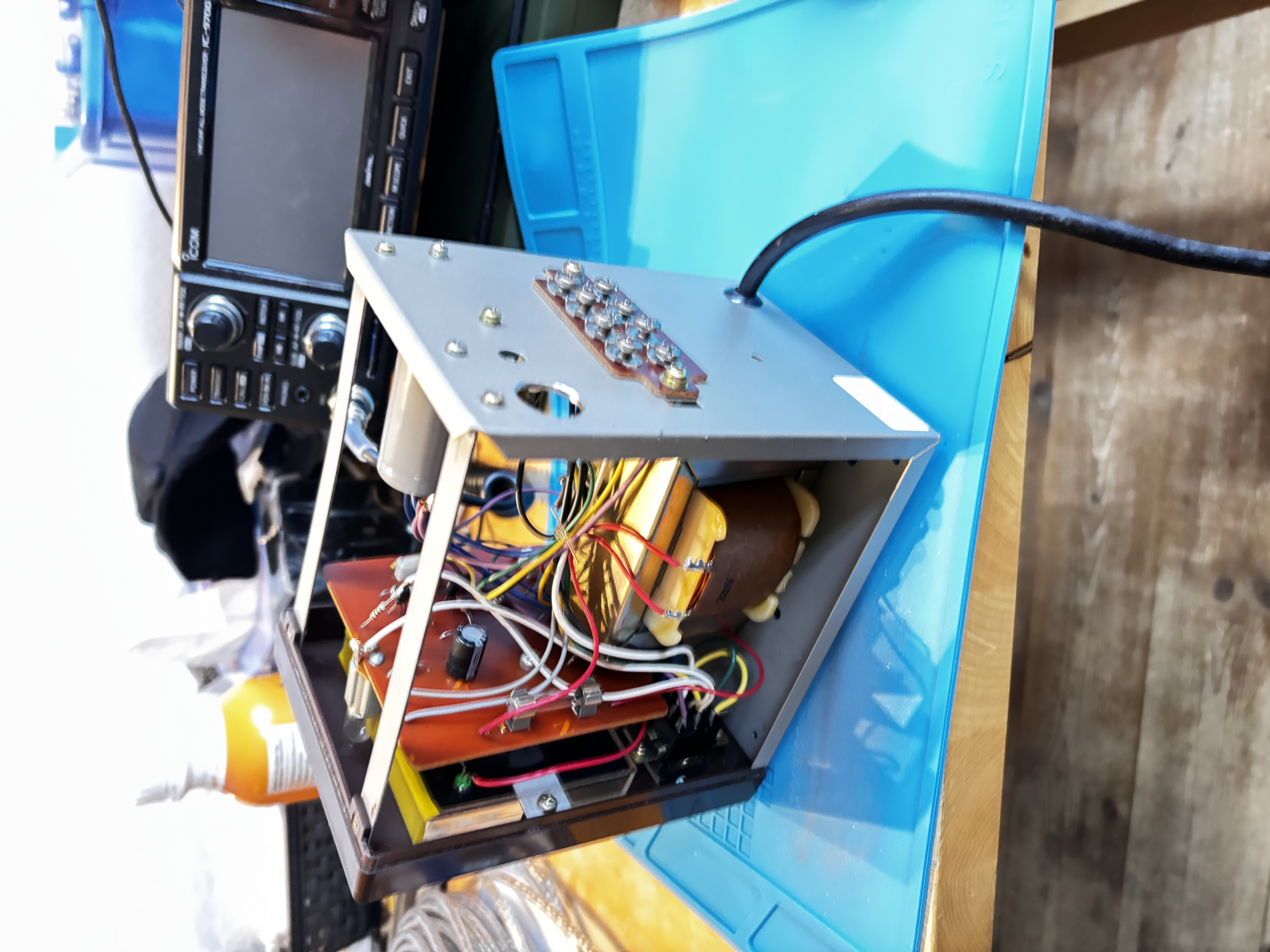 Aus Zeitgründen nutzte ich erst einmal den Batteriebetrieb und führte das Anschlusskabel entlang der Buchse für einen externen Tuner. Dies war solange praktikabel, solange der Transciver nicht bewegt werden musste. Dies änderte sich, da ich den Transciver an verschiedenen Standorten nutzen wollte. Somit wurde die Beendigung der Reparatur nötig.
